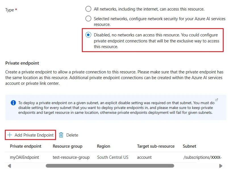 옵션 3: 사용 중지됨, 어떤 네트워크도 이 리소스에 액세스할 수 없다. 이 리소스에 액세스하는 유일한 방법이 될 프라이빗 엔드포인트 연결을 구성할 수 있다.