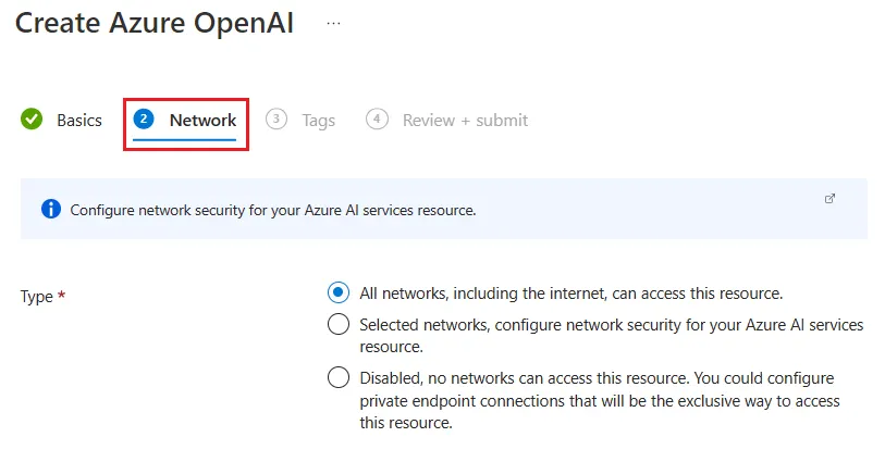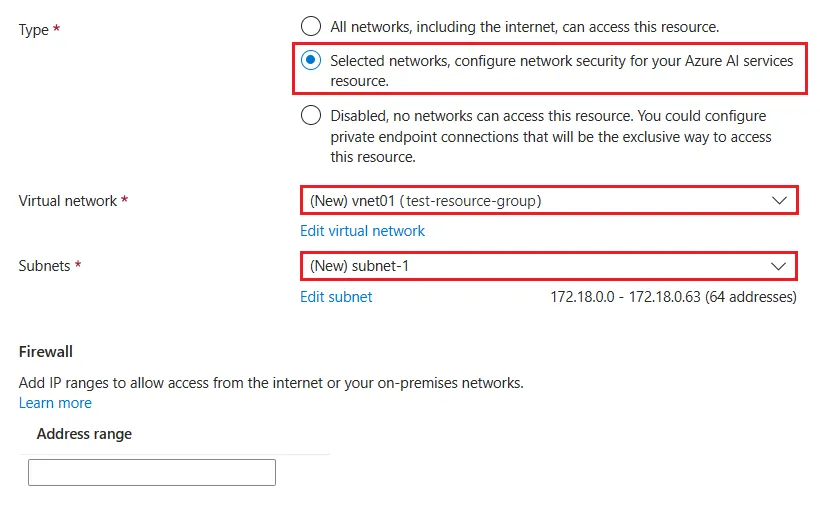 옵션 2: 선택한 네트워크에서 Azure AI 서비스 리소스에 대한 네트워크 보안을 구성한다.