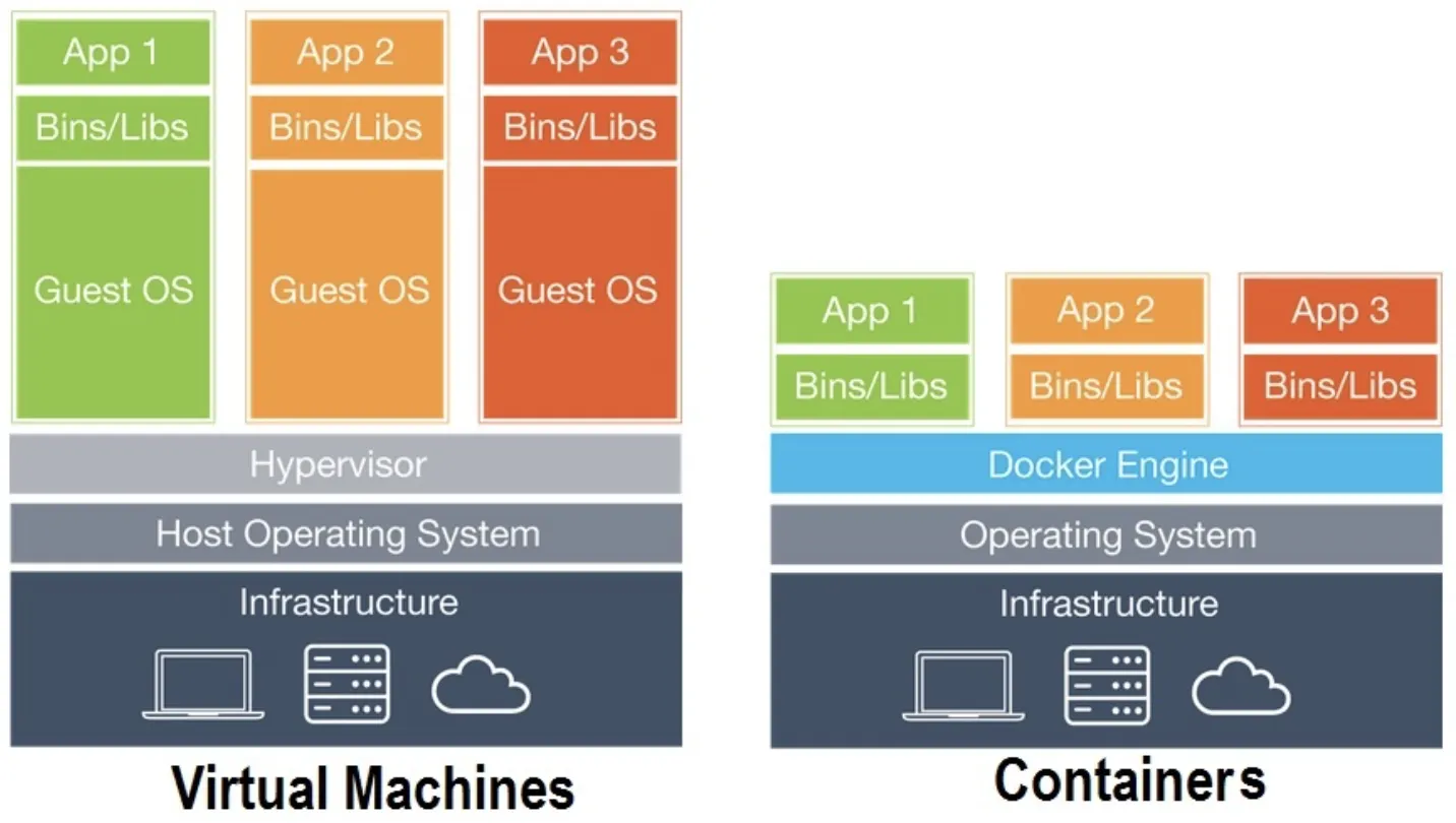 컨테이너는 훨씬 가볍고 운영체제 커널을 공유하며, 시작이 훨씬 빠르고 운영체제 전체 부팅보다 메모리를 훨씬 적게 차지한다.