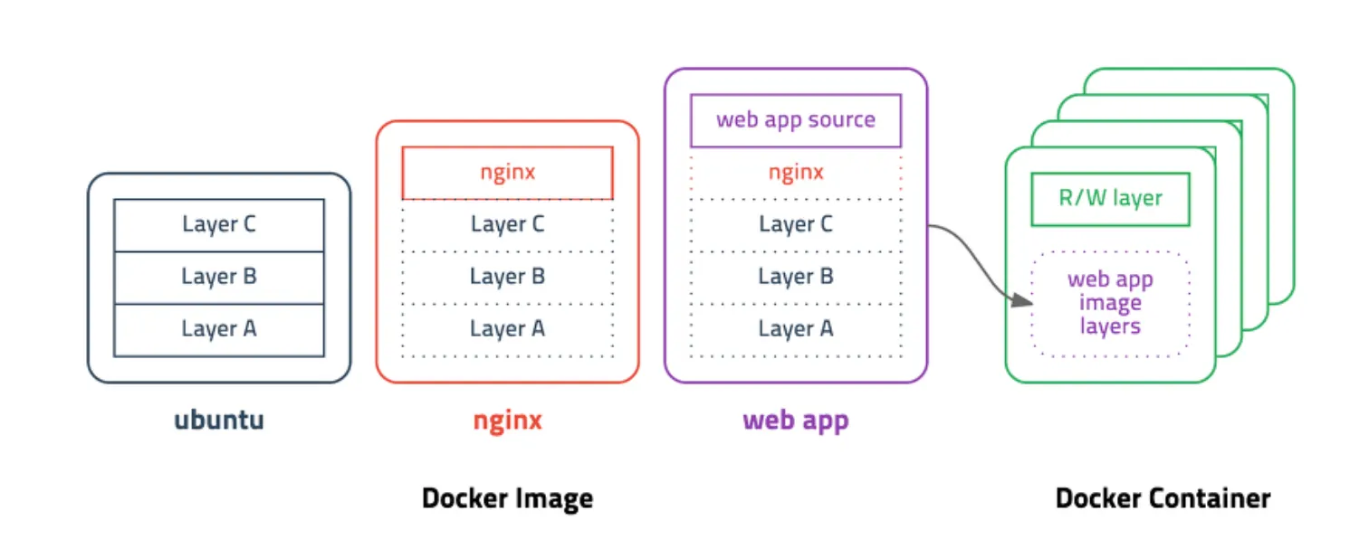 web app 이미지: unbuntu(Layer A,B,C) + nginx Layer+ web app source Layer