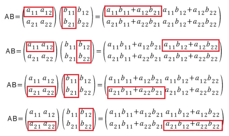 a 행렬의 i번째 행과 B 행렬의 j번째 열의 각 원소를 곱한 값의 합이 c행렬 [i번째 행, j번째 열]의 원소가 됨.