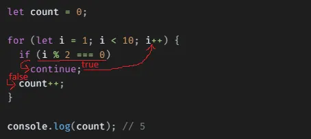 반복문의 코드 블록 실행을 현 지점에서 중단하고 반복문의 증감식으로 실행 흐름을 이동시킨다.