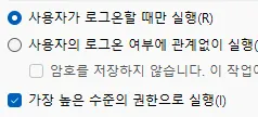 가장 높은 수준의 권한으로 실행 체크 권장(서비스 재시작 권한 이슈를 줄이기 위함).