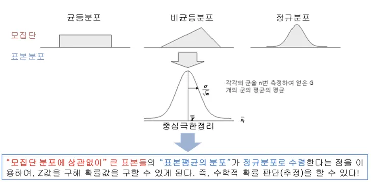 통계학에서 매우 중요한 개념으로, 모집단의 분포와 상관없이 표본 평균의 분포가 큰 표본 크기에서 정규분포에 가까워진다는 내용을 담고 있다.