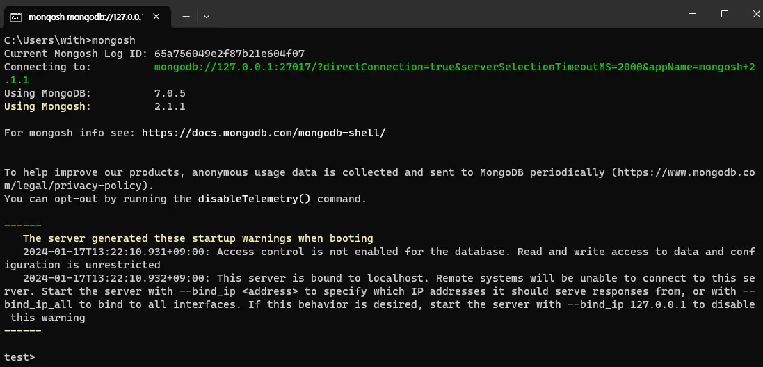 이후 몽고쉘(이전mongo)를 다운받아 bin폴더에 넣어주고 cmd에서 mongosh를 실행시켜 쉘을 띄워준다. 링크 : https://www.mongodb.com/try/download/shell