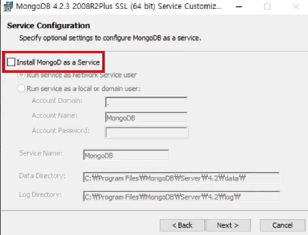 여기서 기본 선택 되어있는 Install MongoD as a Service 를 선택하게 되면 클라우드가 내 데이터베이스 서버가 되는데, 선택 해제 후 Next 해준다.