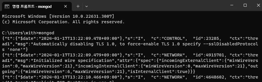 cmd에서 몽고DB 서버인 mongod를 실행시켜 서버를 연다. (켜놔야 서버 동작)
