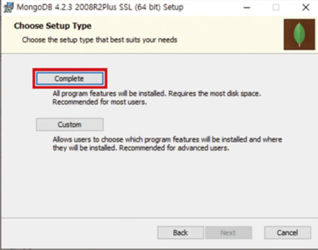 대부분 next 를 누르면 되고, Choose Setup Type 이 나오면 Complete 를 선택