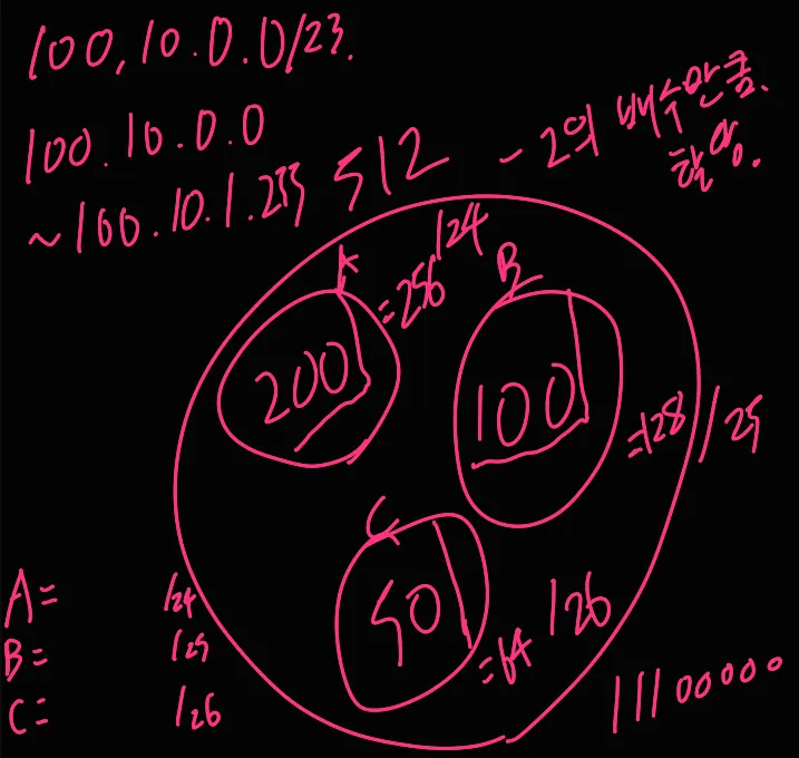 어떤 학교는 공인 IP주소 100.10.0.0/23대역 할당 → 모든 PC에 할당 받은 공인 IP주소 설정 필요 → 각 실습실에 200, 100, 50 대의 PC 설치 - 적절히 서브네팅하라(쪼개라 - 네트워크를 만들어라)