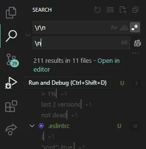 왼쪽 search 메뉴(ctrl + shift + f)에서 다음과 같이 Use Regular Expression 옵션을 활성화한 후, crlf(\r\n) 기호를 lf(\n)로 변경