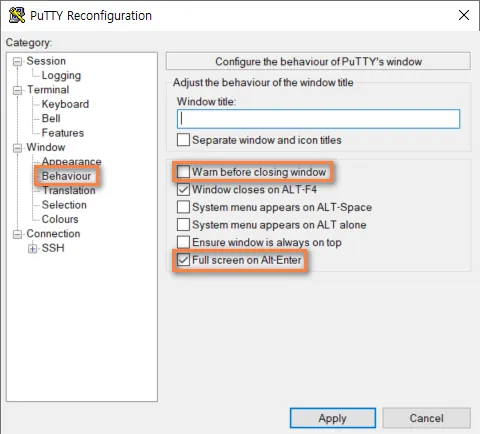 창 닫기 전에 경고표시가 안나오게, Alt + Enter를 누르면 전체 화면으로 전환하기