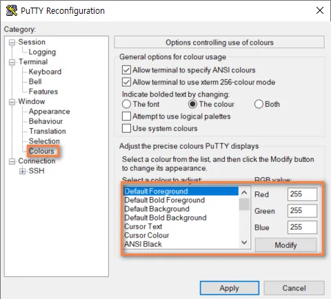 화면에 보여지는 글꼴과 배경색 변경. Select a colour to adjust에서 선택 후 RGB를 바꿔주면 됨.