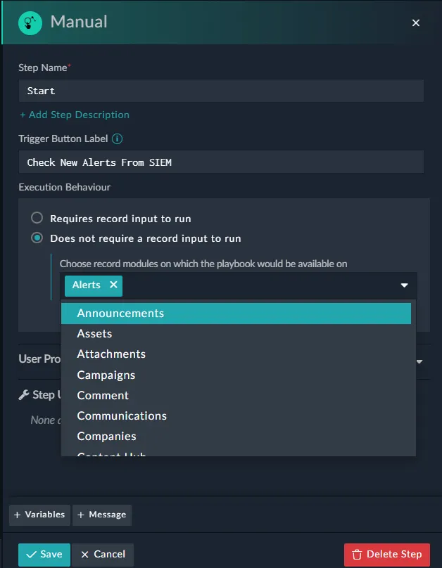 Excute Drop-down 목록에서 이 Manual 트리거를 선택하면 플레이북이 실행되고, 실행 시 등록된 모듈의 레코드(들)가 트리거와 함께 플레이북 환경으로 전달됨.