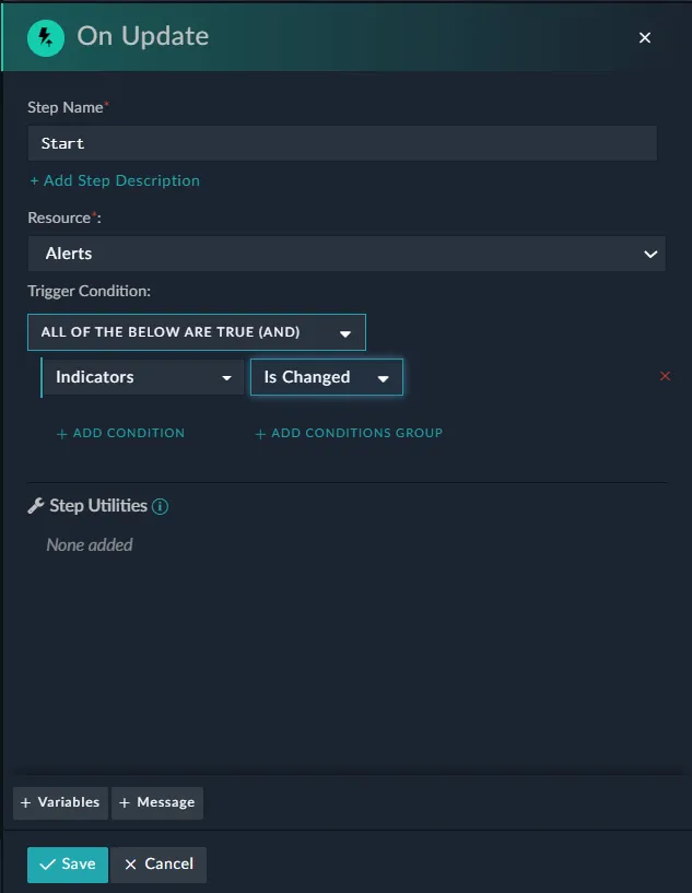 드롭다운 목록에서 논리적 조건인 True(AND) / True(OR) - 상호 배타적(조건에 적용할 조건 중 하나만)를 선택하여 조건이 모두 충족되는 경우에만 플레이북이 트리거