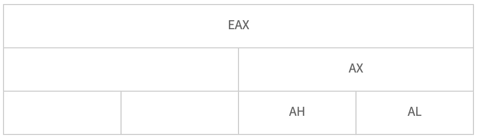 16bit 이하의 레지스터 : AX에서 AH 혹은 AL과 BX에서 BH 혹은 BL 그리고 R8에서 R8L과 같이 상위 8비트와 하위 8비트로 다시 구분하여 끝자리가 H 혹은 L로 변경되거나 접미사 L