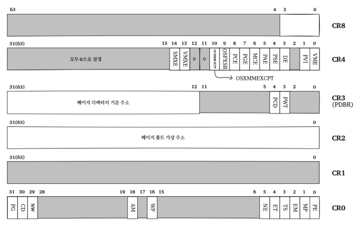 CR0, CR4, CR8 레지스터 - 64bit 중 상위 32bit를 0으로 설정 필요