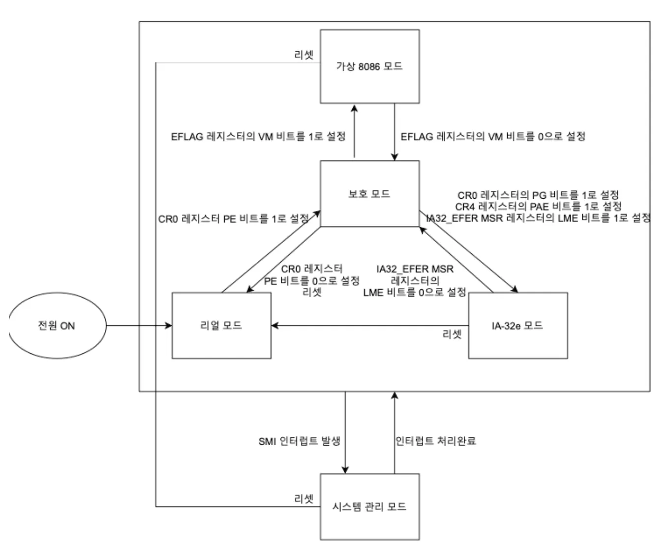 하지만 리얼 모드에서 IA-32e 모드로 전환하려면 아래와 같이 중간에 보호 모드를 거쳐서 전환해야 한다.