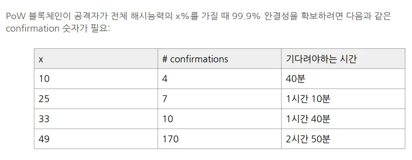 따라서 해시능력을 감안하더라도 임의로 블록체인을 변경하지 못할 정도로 충분히 많은 블록이 생성되기를 기다려야할 필요가 생김
