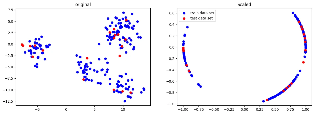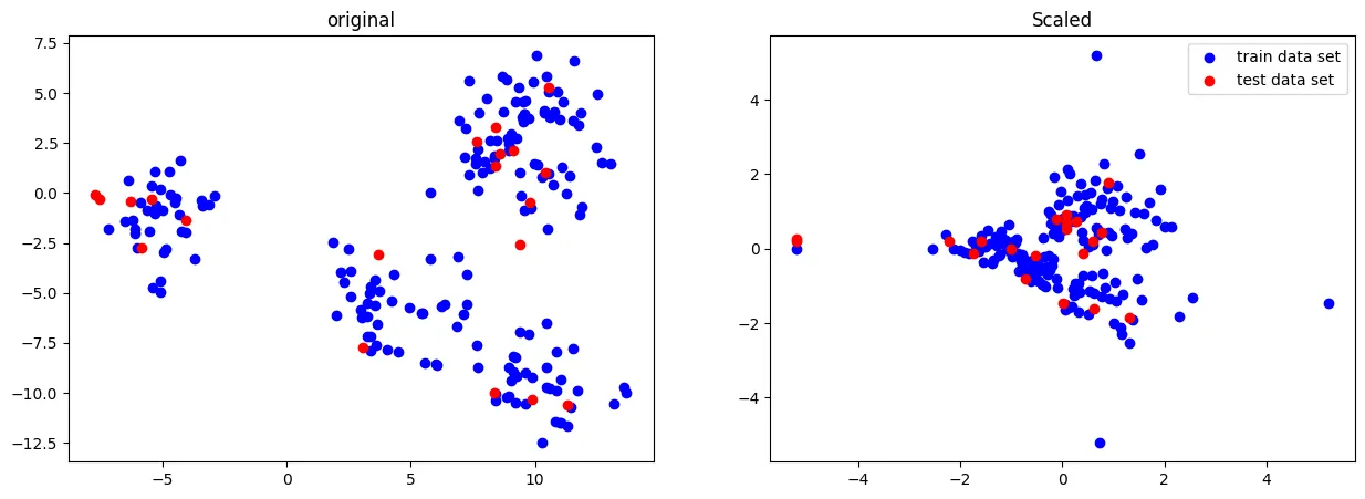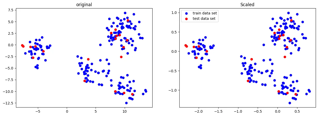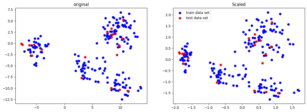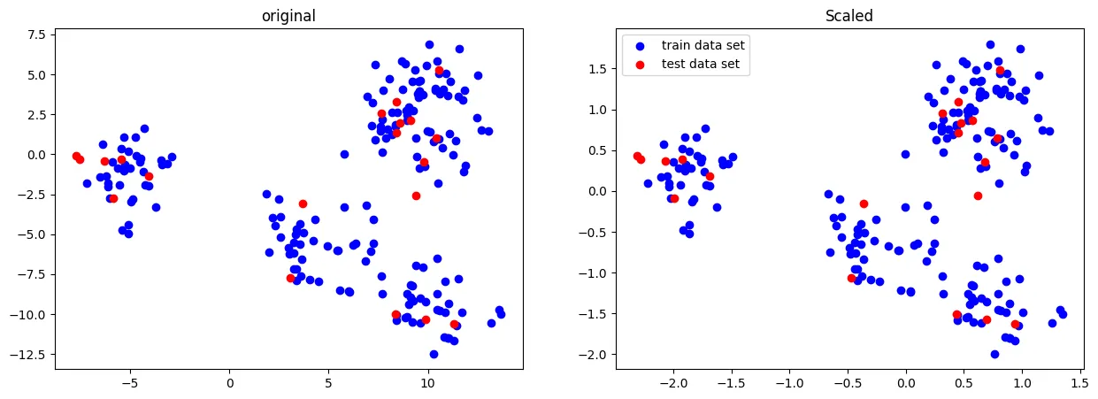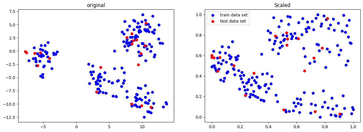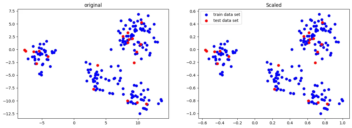 ax[1].scatter(X_scaled[:,0],X_scaled[:,1], c='b', label="train data set")