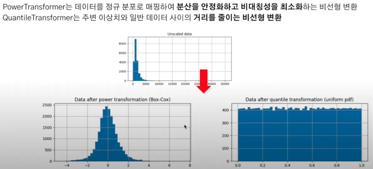 데이터를 균등하게 분포시키거나 정규 분포에 맞출 수 있다.