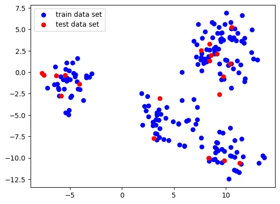 ax[0].scatter(X_train[:,0],X_train[:,1], c='b', label="train data set")