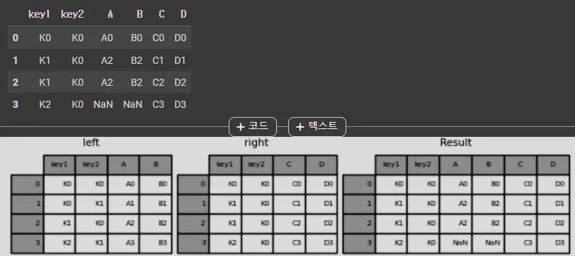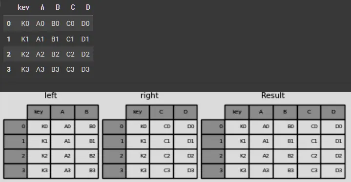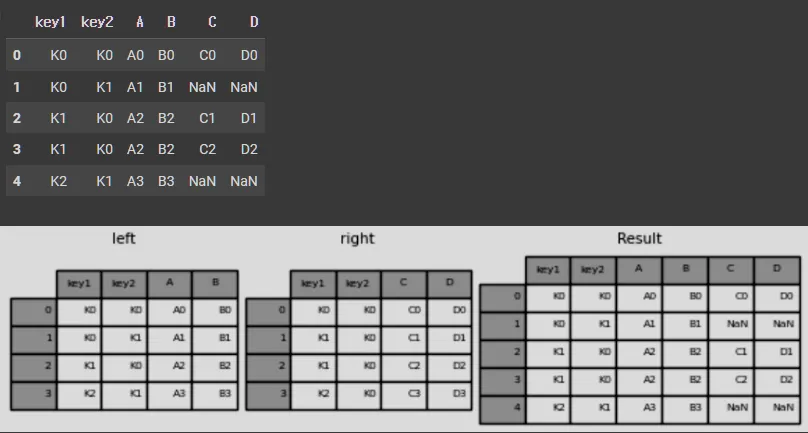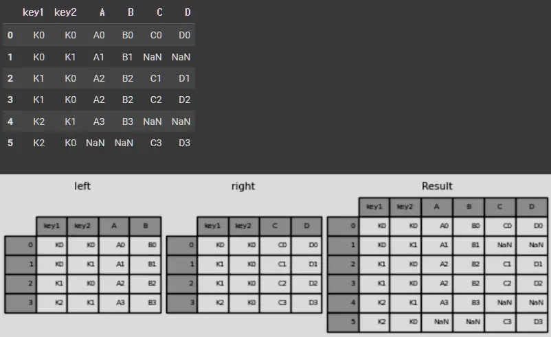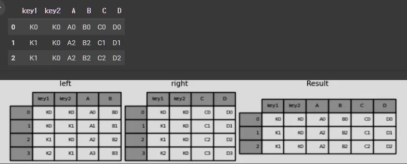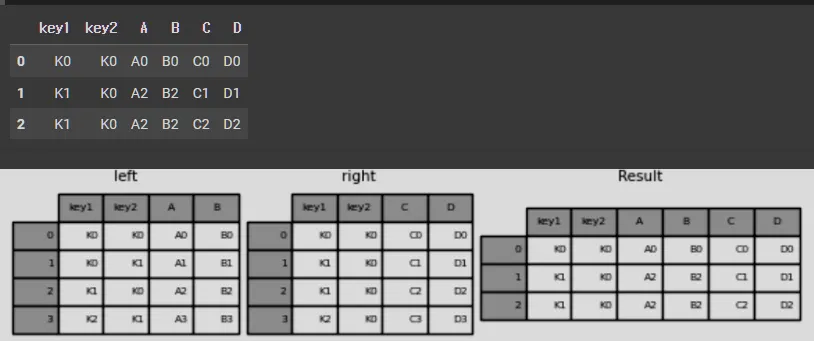 resuSlt = pd.merge(left, right, how="inner", on=["key1", "key2"])