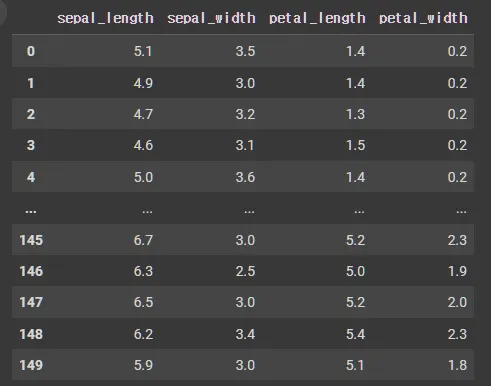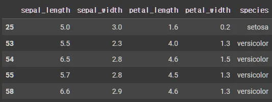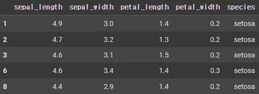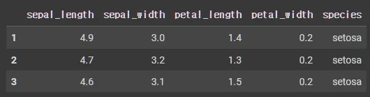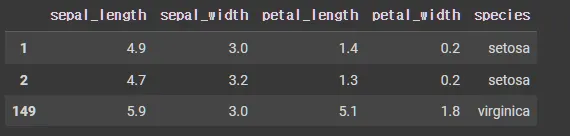 iris.iloc[[1,2,-1]] # -1은 마지막 행번호를 나타냄(loc에서는 사용할 수 없음)