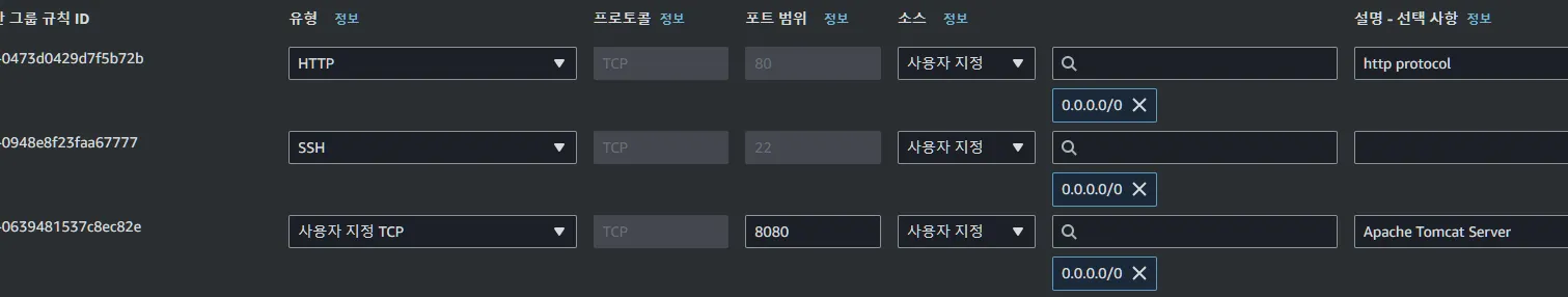 외부에서 내부(ec2)에 접속할 수 있는 Rule 정의