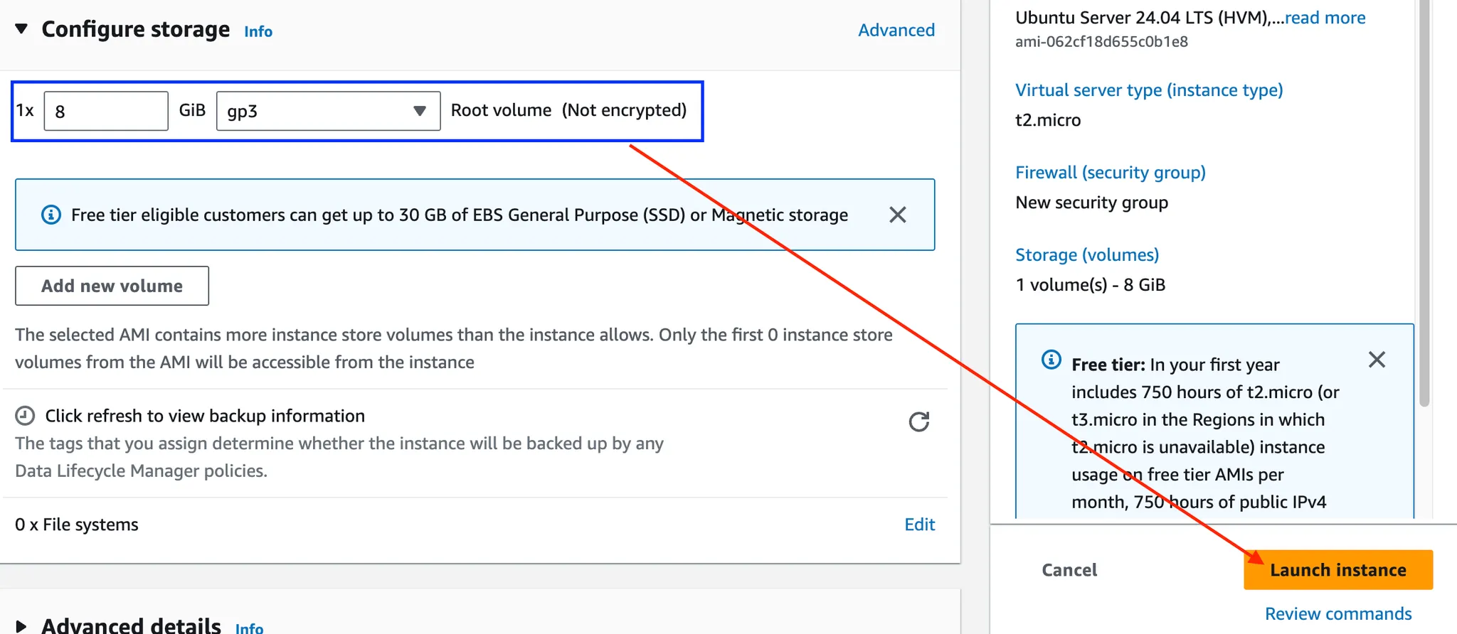 Configure storage & Launch instance
