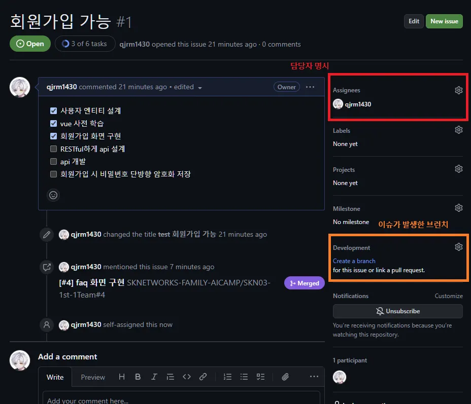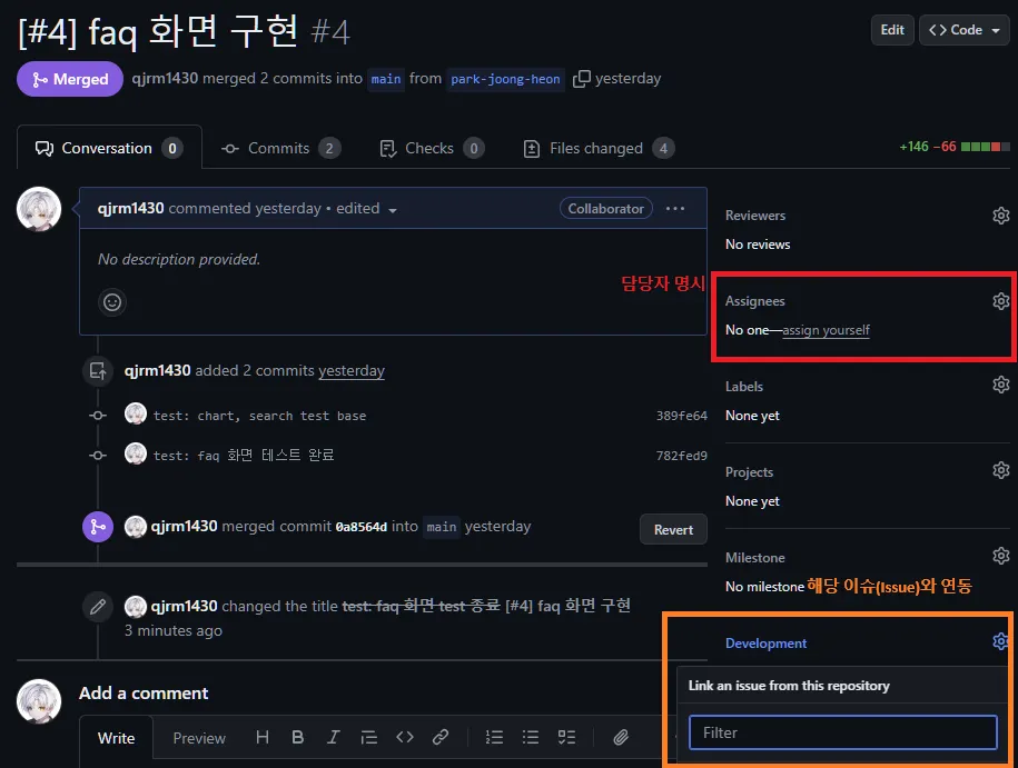 기능에 관련된 Issue라면 Github Project와 PR(PullRequest)과 연동하여 진행상황을 공유할 것
