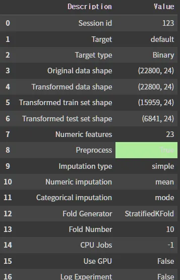 exp_clf = setup(data = train, target = 'default', session_id=123)