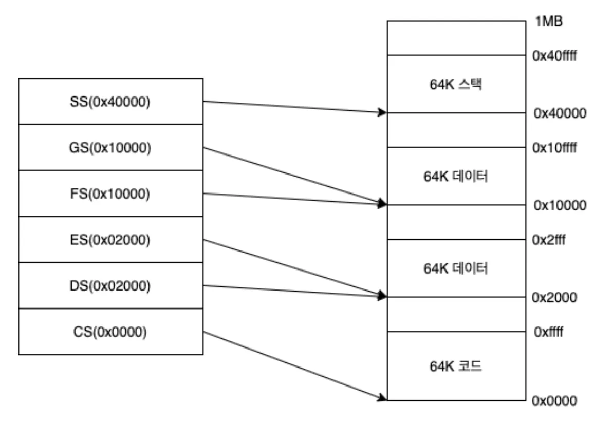 한 세그먼트의 크기는 64K로 고정이며, 세그먼트의 시작 주소는 세그먼트 레지스터에 직접 설정