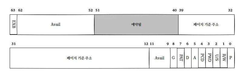 상위 4byte(bit 32 ~ bit 63)는 기준 주소 필드(bit 32 ~ bit 39), 예약된 영역(bit 40 ~ bit 51), 임의로 사용 가능한 영역(bit 52 ~ bit 62), EXB(bit 63)로 구성