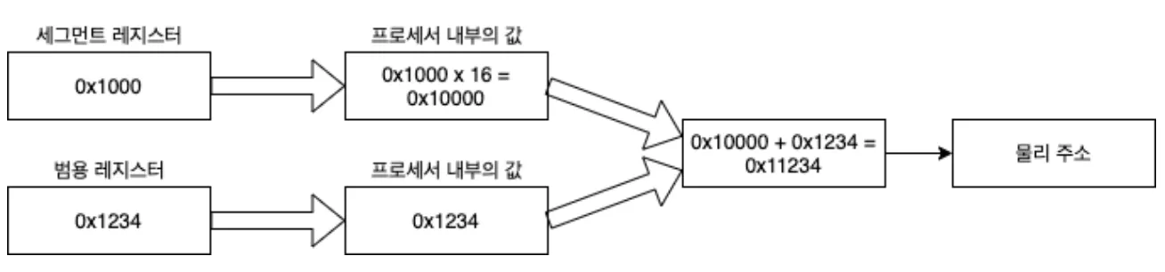 세그먼트 레지스터의 기준 주소 + 범용 레지스터의 값(또는 상수 값) = 물리 주소