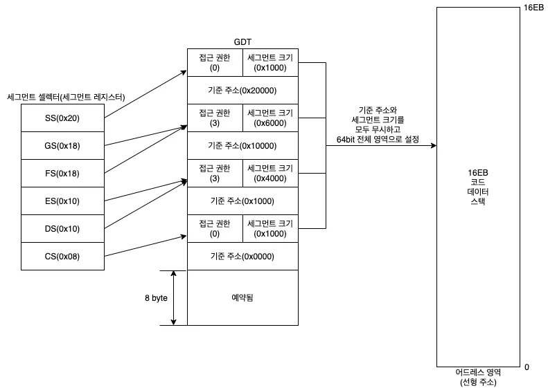 보호 모드에서 사용하던 세그먼트 디스크립터는 32bit 어드레스만 저장하게 설계되었기 때문에 64bit 어드레스 지원을 위해서 디스크립터를 확장하지 않고 강제로 값을 고정함.