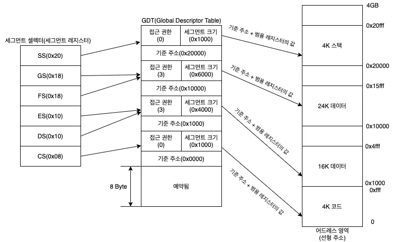 프로세서는 GDT의 위치를 빠르게 넘기기 위해 이를 내부에 저장해두었다가 세그먼트 셀렉터(세그먼트 레지스터)를 통해 주소에 접근할 때마다 GDT의 위치를 찾는데 이용