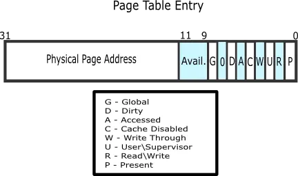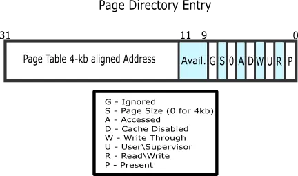 페이지 크기는 최소 4KB이기 때문에 페이지 디렉터리 엔트리, 페이지 테이블 엔트리 모두 bit 0 ~ bit 11까지는 속성 필드로 사용되고 bit 12 ~ bit 31까지는 기준 주소를 나타내는 데에 사용
