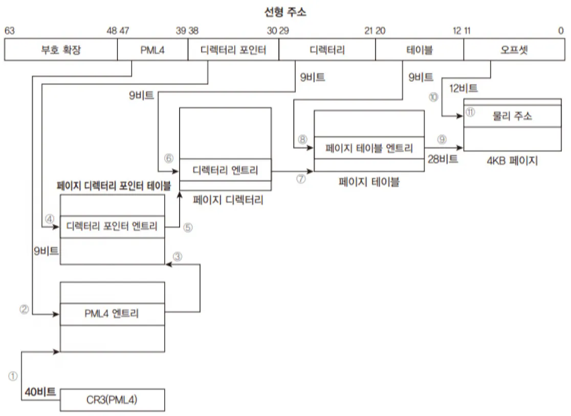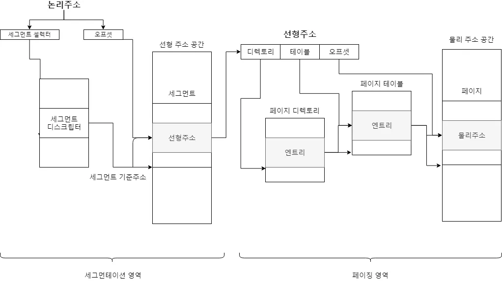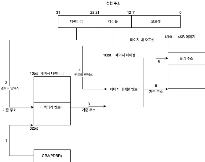 선형 주소는 페이징 기법의 입력 값이 되며, 페이징을 사용하지 않는다면 선형 주소는 물리 주소와 1:1로 대응