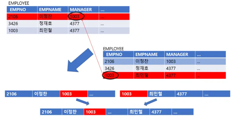 -- EMPNAME 테이블에 어떤 사원의 MANAGER 번호가 같은 테이블 내에서 어떤 사원의 EMPNO와 같으면 그 사원이 직속 상관