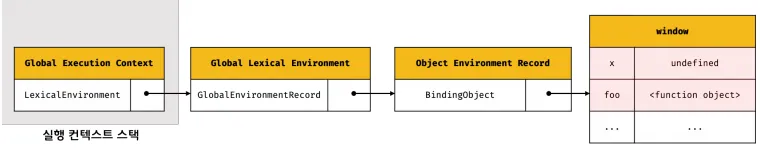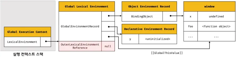전역 코드 평가 과정에서 var 키워드로 선언한 전역 변수와 함수 선언문으로 정의된 전역 함수 → 전역 환경 레코드의 객체 환경 레코드에 연결된 BindingObject를 통해 전역 객체의 프로퍼티와 메서드가 됌