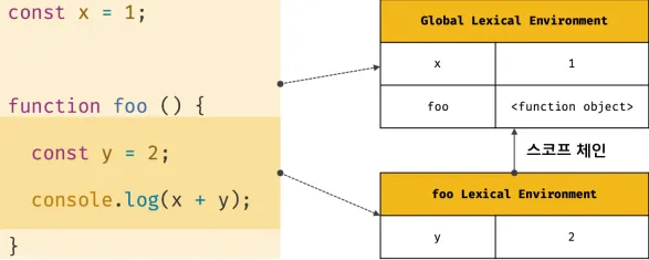 중첩 관계에 의해 스코프 체인을 형성하여 식별자 검색 가능 필요