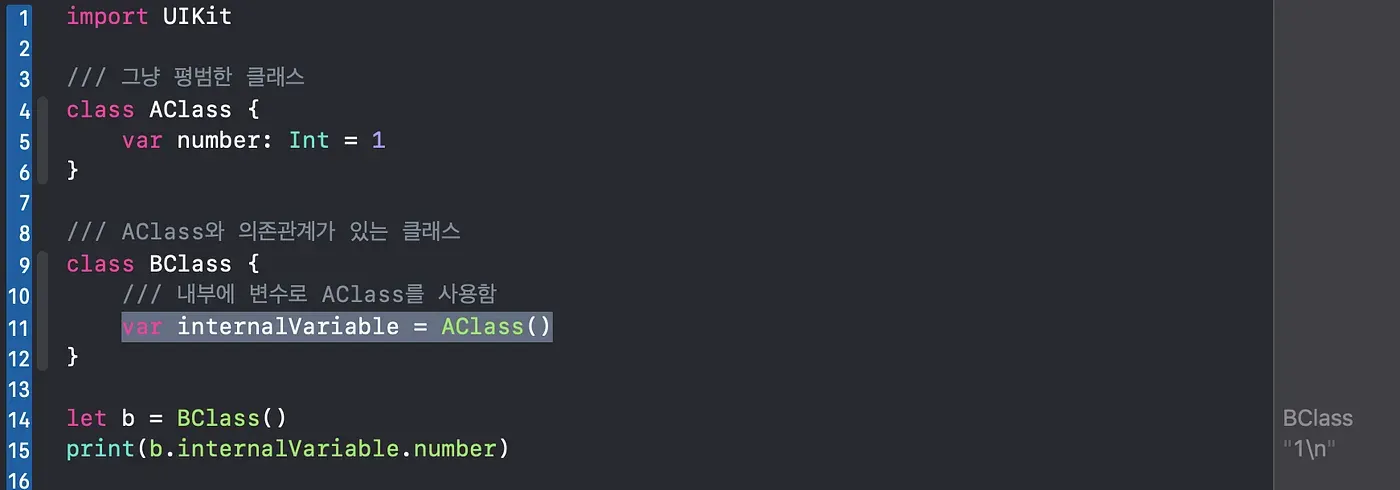 아래와 같이 B 클래스에서 A 클래스를 내부에 변수로 사용하게 됨으로써