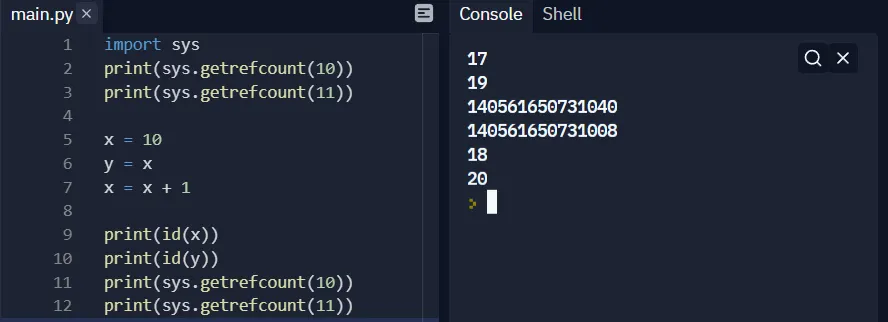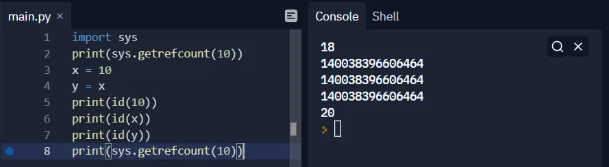 x와 y를 10이라는 integer 객체를 참조하게 하자 18 -> 20 으로 증가함을 볼 수 있다.