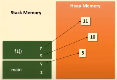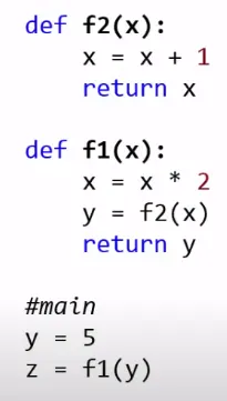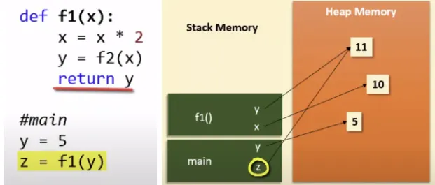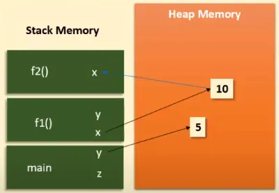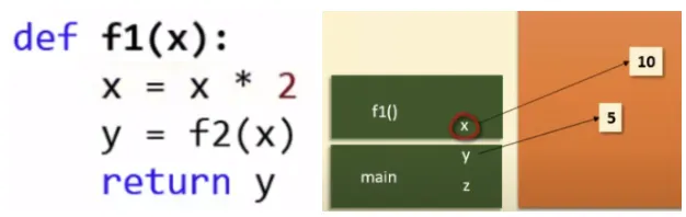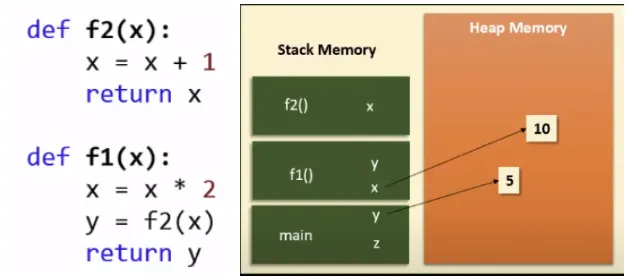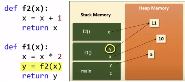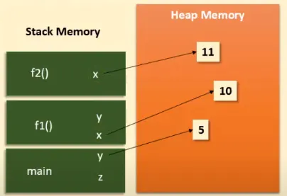 f1 지역변수 y가 생성되고, f2 함수가 스택 메모리에 쌓이면서 f2의 매개변수(x)가 생성