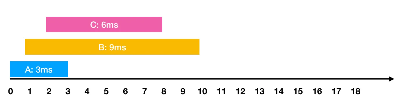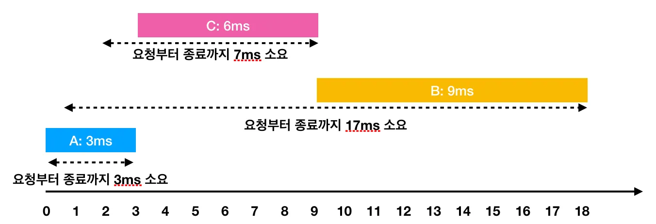 이렇게 A → C → B의 순서로 처리하면 각 작업의 요청부터 종료까지 걸린 시간의 평균은 9ms(= (3 + 7 + 17) / 3)가 됩니다.