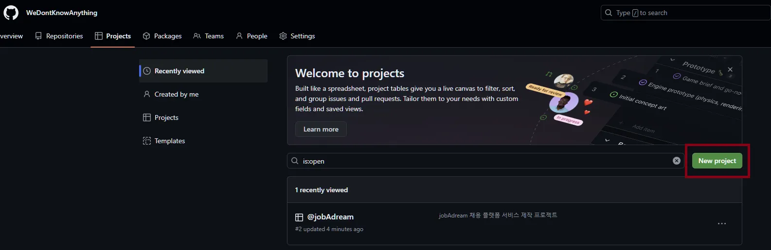 프로젝트에 맞는 템플릿을 고른다. 필자는 Kanban Board 템플릿을 사용