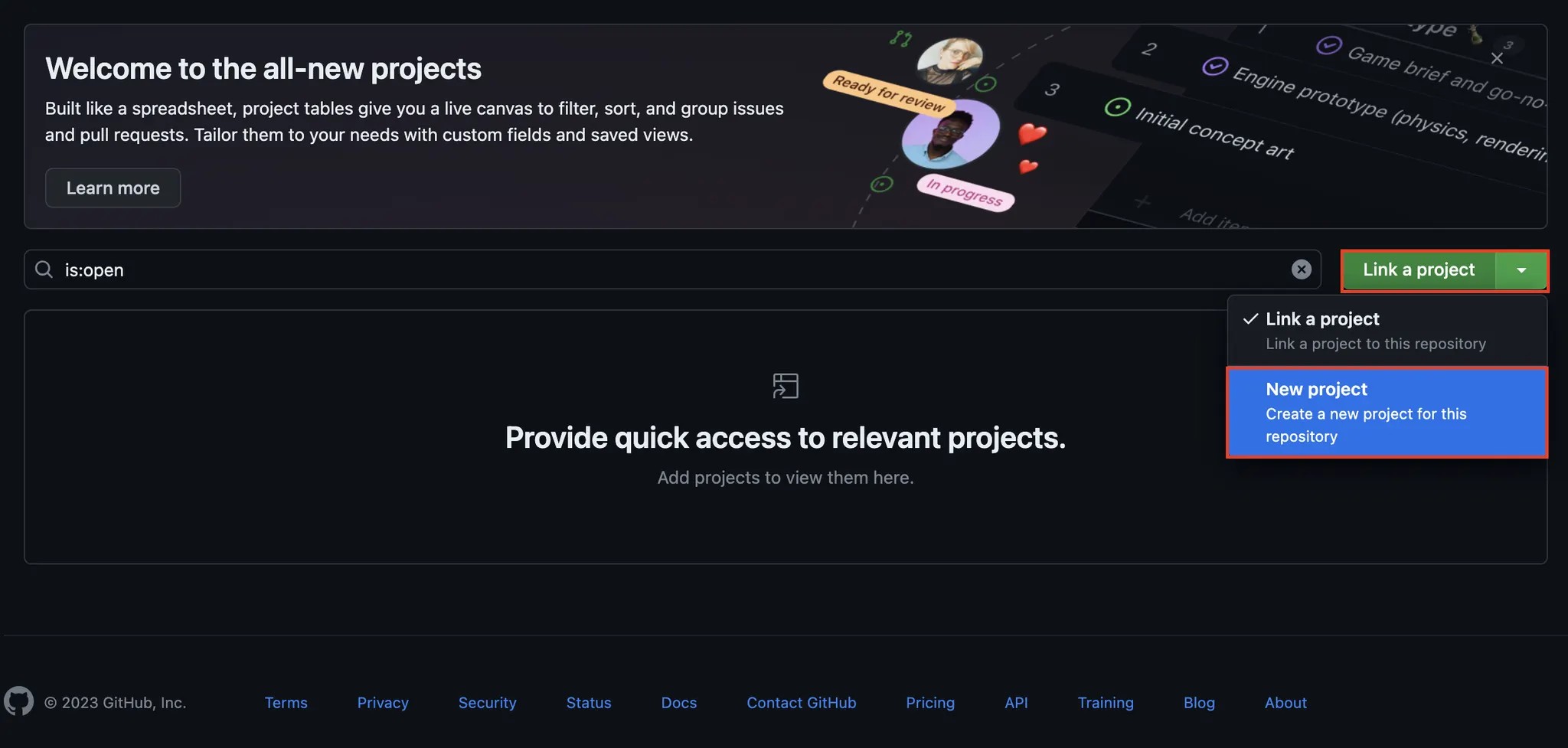 Link a project 버튼 옆의 화살표 탭 클릭후, New Project 를 클릭, 버튼이 New Project로 변경되면 클릭
