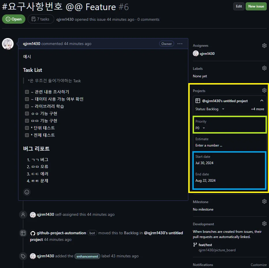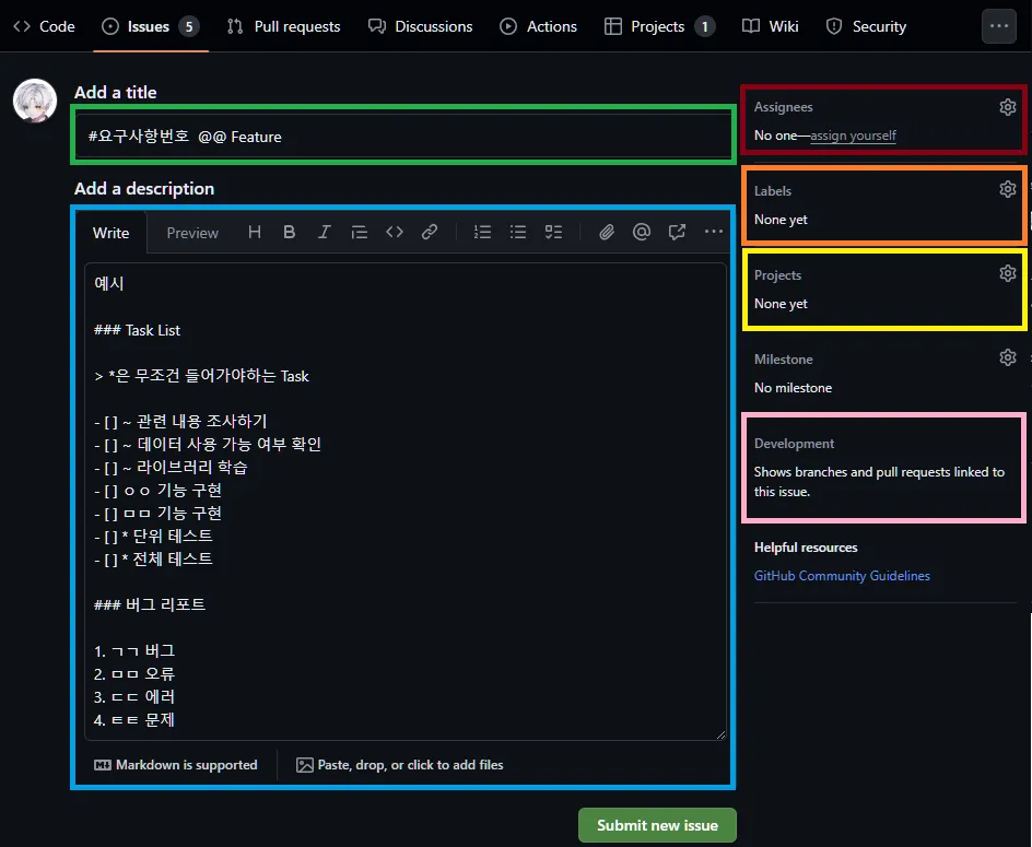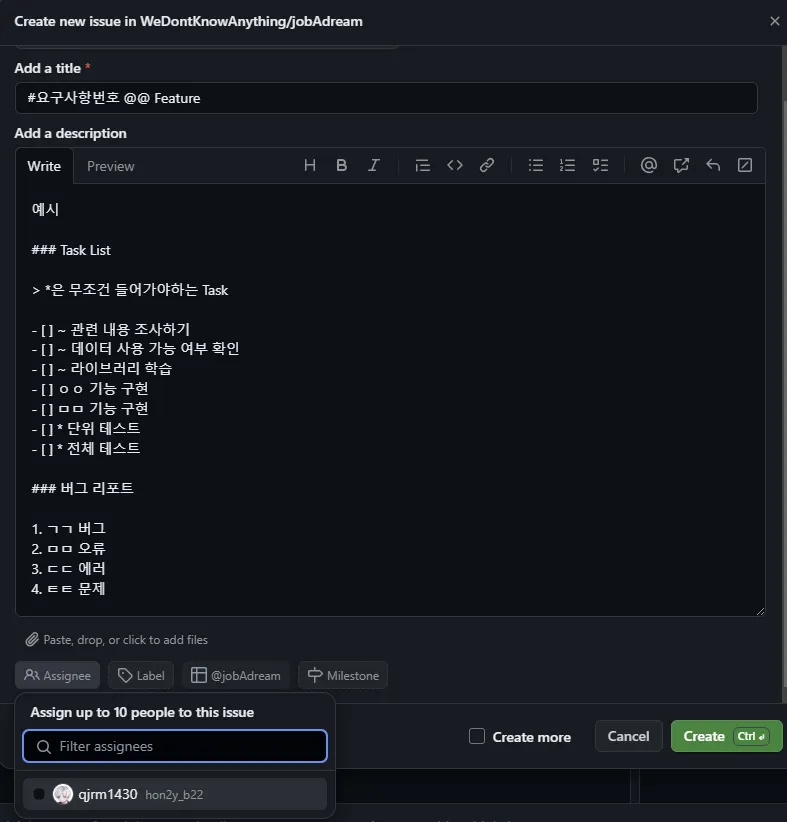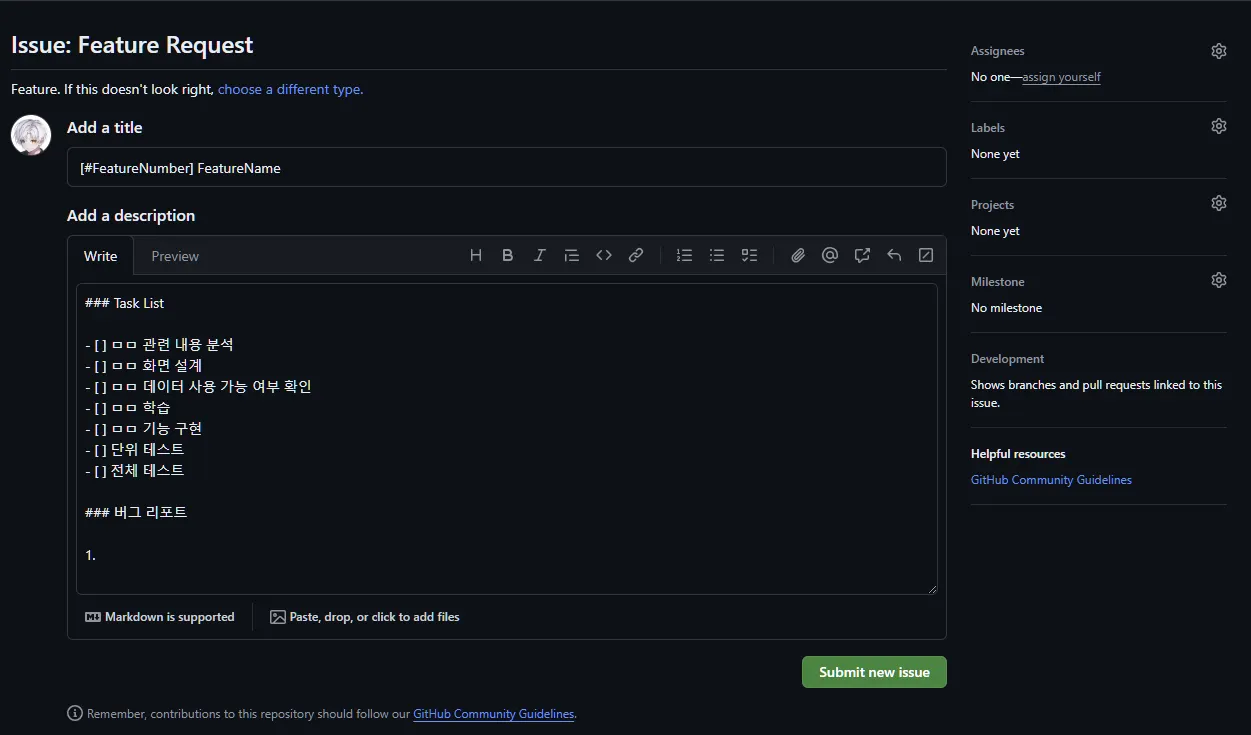 매번 Issue를 생성하여 폼에 맞춰서 글 작성을 하는 것도 번거롭고 중구난방으로 작성되는 것을 방지하기 위해 총 2개의 Issue 템플릿을 만들었다.