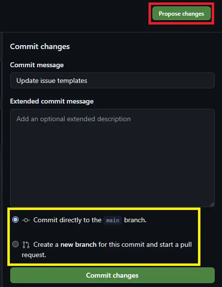 우측 상단에 Propose changes를 누르면 Commit 창이 나온다.