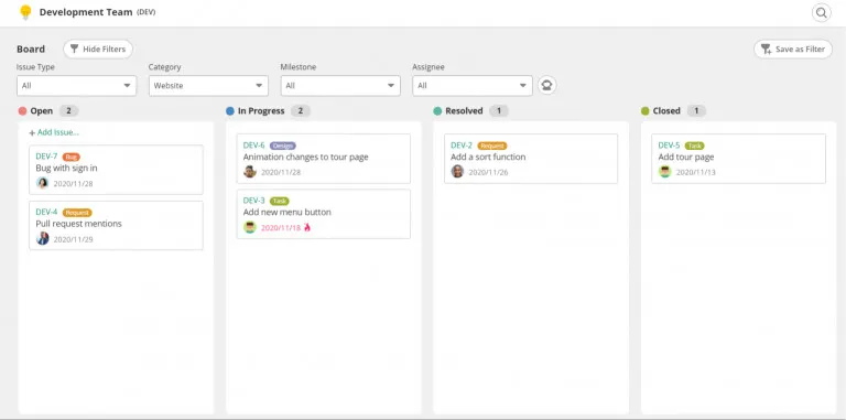 보드에서 업무는 열로 구성된 프로젝트 보드에 표시되며, 각 열은 업무 단계를 나타낸다.